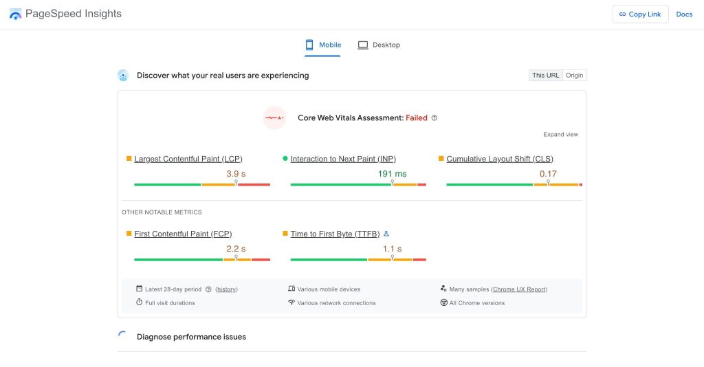 Check your Largest Contentful Paint score. It’s the first thing you’ll see under Core Web Vitals Assessment. If it’s above 2.5 seconds, your largest visible content (usually an image) is loading too slowly.